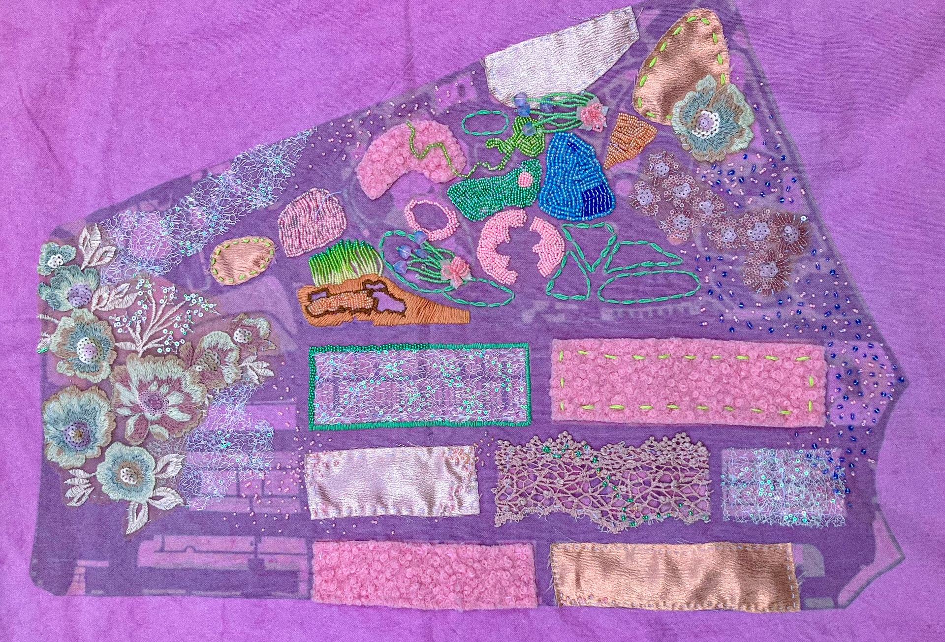 Des étudiants de l’École nationale supérieure des Arts Décoratifs ont été conviés à vivre une expérience immersive au Jardin des Plantes de Paris. Après deux visites guidées et enrichis des connaissances acquises dans le cadre du projet de recherche Cabinet de la mémoire, ils ont été invités à réaliser une série de cartographies du jardin, visant à recréer des parcours oniriques. Ces cartes ont été conçues en utilisant des techniques de teintures végétales, de teinture à l’indigo, de broderie, de patchwork et d’incrustation de perles.